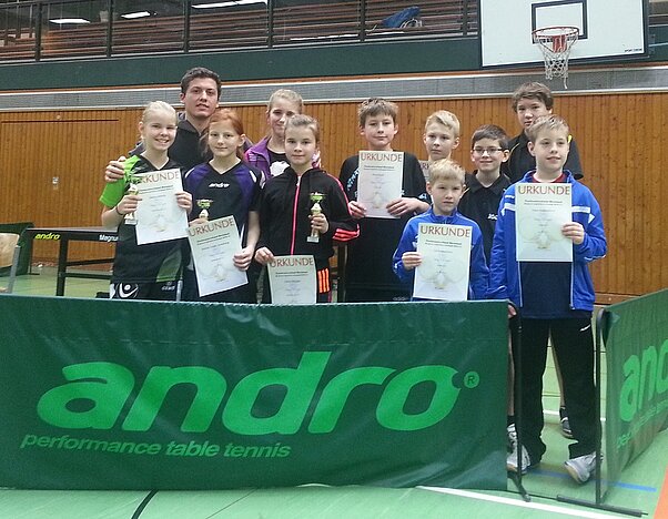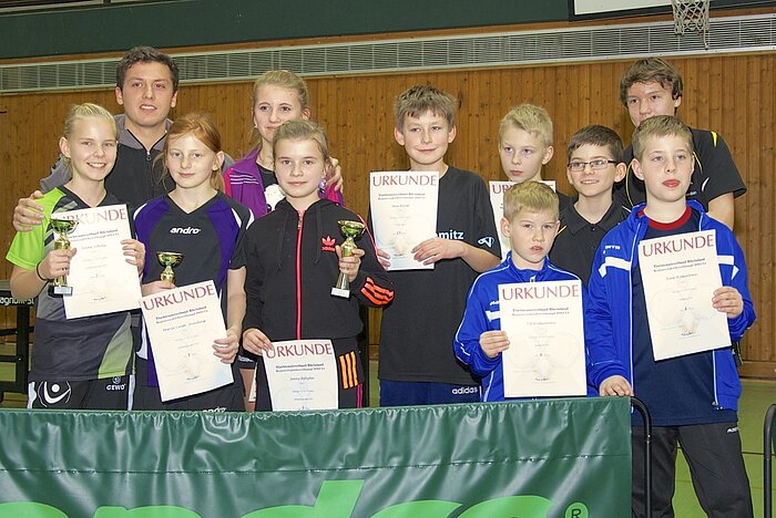 Für die Region Eifel an den Start gingen(siehe Foto): Maria-Luisa Gneiding, Christiana Schäfer, Jenny Rebzda, Dennis Muchamedin, Dennis Zimonzcyk, Niko Diamadis (alle TTG Daun-Dockweiler-Gerolstein), Jenny Schalz(TTC Schwirzheim), Max Klink(TTG Schüller-Kerschenbach), Til Rodenborn, Finn Rodenborn(SV Burg Schönecken), Dirk Petzold(Betreuer)