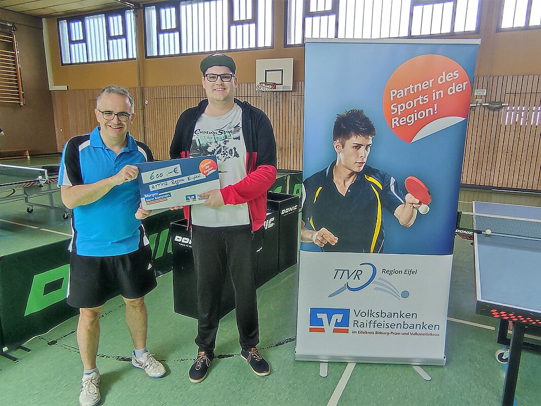 Stefan Wenz, Kreisvorsitzender und Simon Hell, Kreisbeauftragter Erwachsenensport konnten sich bereits anlässlich der der Kreispokalendrunde bei Detlef Maiers, als Vertreter der vier Genossenschaftsbanken Volksbank RheinAhrEifel, Volksbank Eifel, Raiffeisenbank Westeifel und der Raiffeisenbank Irrel für die jahrelange Unterstützung des Tischtennissports in der Region bedanken.