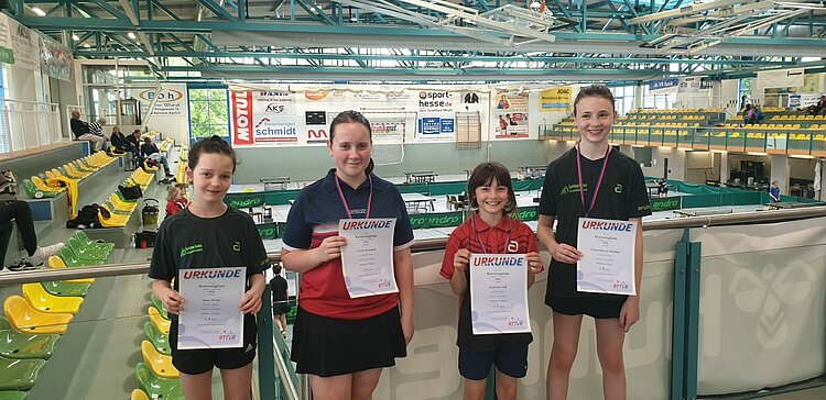 Die Mädels spielten zu viert. Hier siegte Laura Hansult (TTF Asbacher Land) vor Anna Maria Reichel (TV Arzheim) und Kim Lea Söll (TuS RW Koblenz). Kim Lea Söll lieferte sich dabei mit Laura einen spannenden Fight. Im fünften Satz in der Verlängerung musste Kim aber ihrer Gegnerin zum Sieg gratulieren.