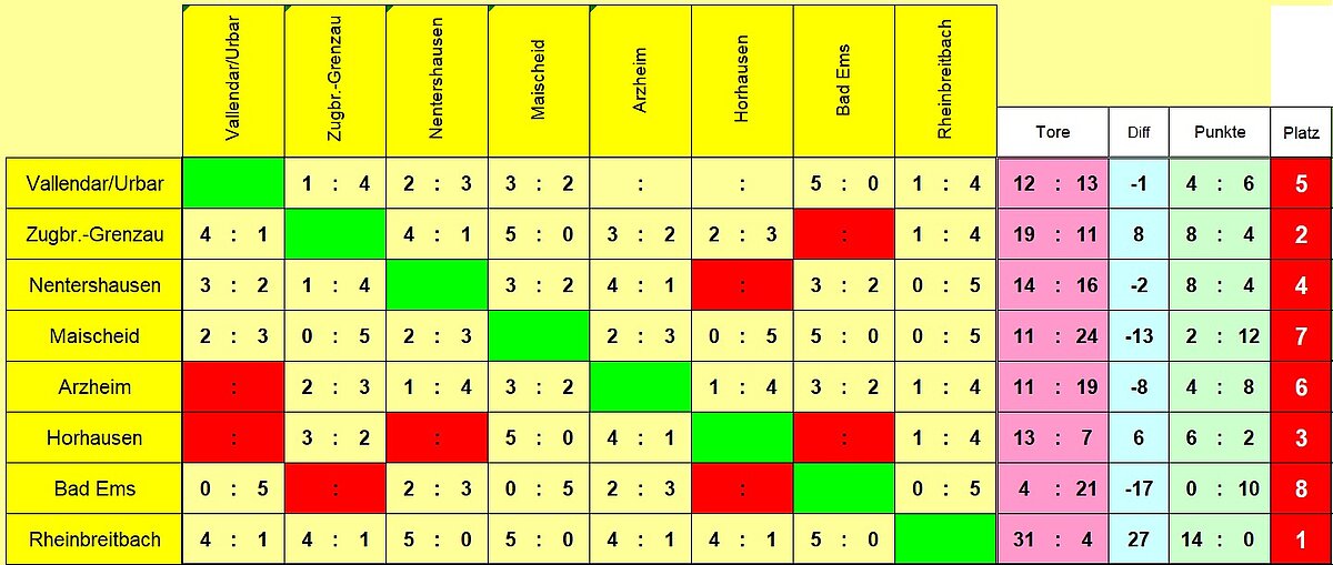 Rheinbreitbach darf sich bereits jetzt als Sieger der diesjährigen Mädchenrunde küren. Die Rheinbreitbacherinnen gewannen auch heute beide Spiele und hielten sich somit schadlos. Mit 14:0 Punkten und 31:4 Spielen können sie auch von Horhausen, Grenzau und Nentershausen nicht mehr eingeholt werden, auch wenn diese Mannschaften noch Spiele zu absolvieren haben.