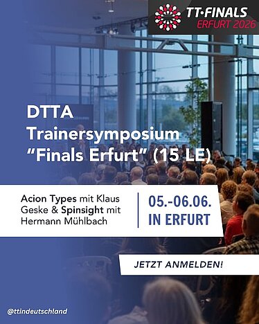 Am 5. und 6. Juni findet im Victor’s Residenz-Hotel an der Erfurter Messe das 2. Trainersymposium der DTTA statt – ein Fortbildungsformat für Trainerinnen und Trainer aller Lizenzstufen, das als fester Bestandteil in die Finals integriert wird. Nach der erfolgreichen Premiere im Vorjahr verbindet das Symposium erneut Theorie und Praxis und liefert gezielte Impulse für den Ausbildungsalltag der Trainerinnen und Trainer.