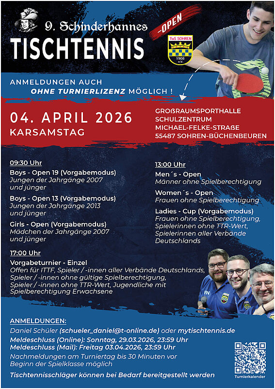 Am 04.April 2026 (Ostersamstag) richtet die Tischtennis-Abteilung des TuS Sohren die 9.Schinderhannes-Tischtennis-Open in der Großraumsporthalle des Schulzentrums Sohren-Büchenbeuren aus.