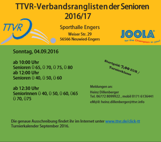 !!! Achtung Änderung !!! - TTVR-Verbandsranglisten der Senioren