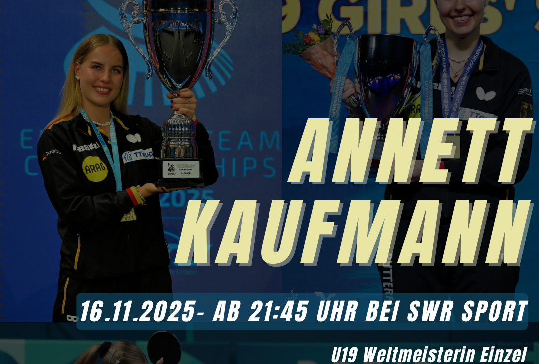Heute Abend, am 16. November 2025, steht die Tischtennisspielerin Annett Kaufmann im Mittelpunkt der Sendung SWR Sport. Ab 21:45 Uhr zeigt das Format ein Porträt über die junge Athletin, die bereits U19-Weltmeisterin wurde, bei den Olympischen Spielen 2024 Platz vier im Team erreichte und dreifache Europameisterin im Damen-Team ist.