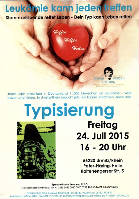 Das 11-jährige Mädchen ist an Leukämie erkrankt und benötigt umgehend eine Stammzellenspende. Zu diesem Zweck sind alle im Alter von 16-40 Jahren (ab 16 mit Einverständnis der Eltern) aufgerufen, sich am 24.07.2015 von 16-20 Uhr im Foyer der Peter-Häring-Halle in Urmitz/Rhein - Kaltenengerser Str. 5, typisieren zu lassen.
