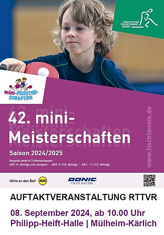 Bereits zum wiederholten Male veranstaltet der Verband die Auftaktveranstaltung der mini-Meisterschaften. Wer gerne Tischtennis spielt oder dies gerne einmal ausprobieren möchte, darf sich auf Sonntag, 08. September 2024 in der Philipp-Heift-Halle in Mülheim-Kärlich freuen. Hier sind die Kleinsten ab 10.00 Uhr bei der Auftaktveranstaltung der mini-Meisterschaften unter der Regie des RTTVRs in Zusammenarbeit mit dem TTC Mülheim/Urmitz-Bahnhof einen Tag lang die Größten. Die Veranstaltung fügt sich als besonderes Highlight in das Jubiläumsjahr (75 Jahre) des RTTVR ein.