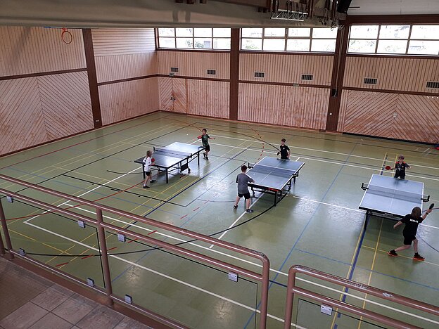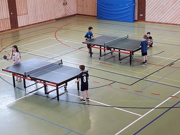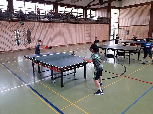 Morgens starteten die Trainer, Felix Füzi und Landestrainer Lucas Krenzer leiten die Sichtung, nach einer Vorstellungsrunde mit schwierigen koordinativen Übungen. „Uns geht es auch darum herauszufinden wie die motorischen Fähigkeiten bei den Kindern ausgeprägt sind“, erklären sie. Sie versuchen viele der Trainingsinhalte spielerisch durchzuführen, daher wurde auch das Schnelligkeitstraining in Form eines Fangspiels gestaltet. - Als es dann an die Tische geht und die ersten Bälle gespielt werden dürfen, geht man ebenfalls so vor und testet damit die Fähigkeit der jungen Talente zur genauen Platzierung der Spielgeräte. Und obwohl das allen viel Spaß gemacht hat, scheint der Wettkampf für die Kinder jetzt der Höhepunkt zu sein. „Genau so soll es sein, schließlich trainieren wir genau für diese Vergleiche mit anderen“, erklärt Felix Füzi und beobachtet das Geschehen an den Tischen wieder.