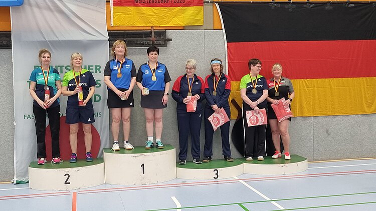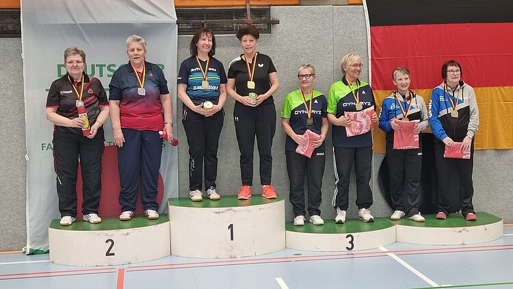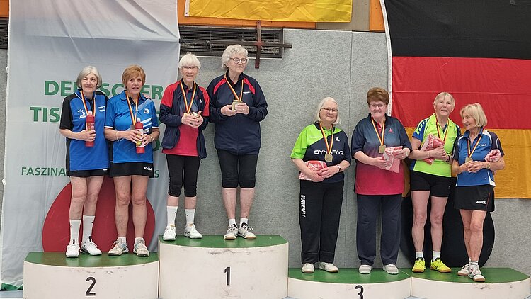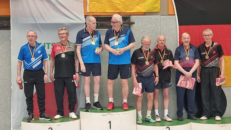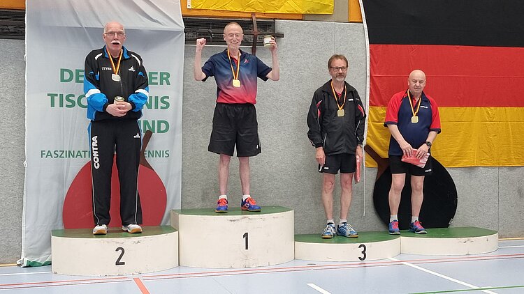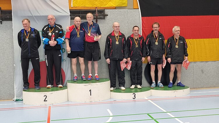 Ahrensburg. Für einige Spielerinnen und Spieler aus der 26-köpfigen Delegation des Tischtennisverbandes Rheinland-Rheinhessen (RTTVR) war es der Höhepunkt ihrer bisherigen sportlichen Karriere: Vom 29. April bis zum 1. Mai 2023 fanden die Deutschen Tischtennis-Einzelmeisterschaften der Senioren in Ahrensburg (Schleswig-Holstein) statt. Normalerweise zählt die Kleinstadt rund 34.000 Einwohner, an diesem ersten Maiwochenende kamen insgesamt 562 Tischtennis-spielende Gäste hinzu. Und die Rekord-Delegation aus Rheinland und Rheinhessen – es war die größte des Verbands in der Turniergeschichte - konnte gleich mehrere Medaillen aus dem hohen Norden Deutschlands entführen.