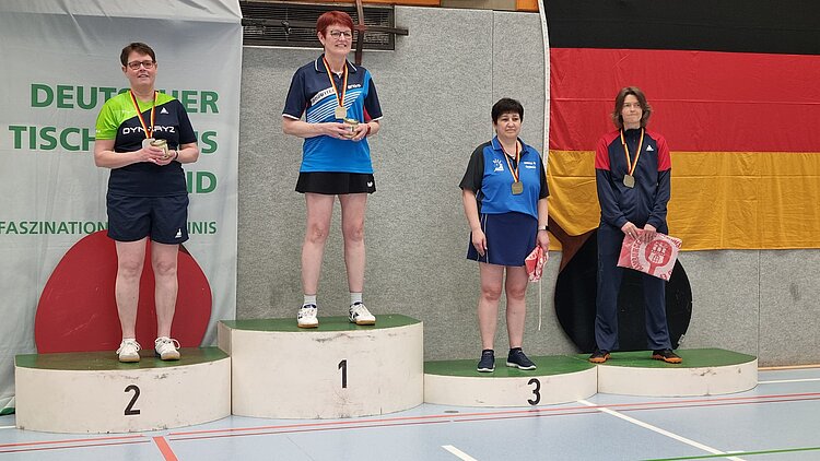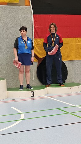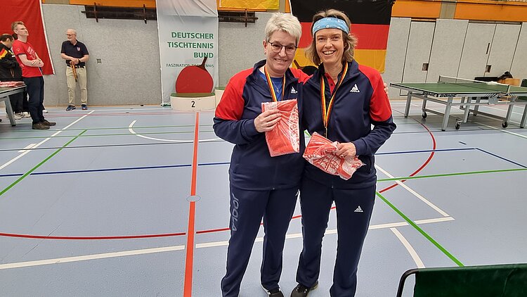 Doch auch ohne das Coaching Scheels, der in DTTB-Funktion am Samstag auch noch die alleinige Turnierleitung in der kleineren der beiden Hallen innehatte, konnten die RTTVR-Athleten überzeugen. Antje Bauer (CFT Sinzig) und Kornelia Braun (SG Langenhahn/Rothenbach) aus der Klasse Seniorinnen 55 konnten direkt bei ihren ersten Deutschen Meisterschaften einen Überraschungserfolg verbuchen. Für Bauer, die sich als Gruppenerste mit 3:0 Spielen und 9:2 Sätzen souverän durchgesetzt hatte, war in der Einzelkonkurrenz erst im Halbfinale Schluss, als sie sich der ehemaligen Bundesligaspielerin und späteren Deutschen Meisterin Maria Beltermann (WTTV) mit 1:3 geschlagen geben musste. Im Doppel erreichte sie mit ihrer Westerwälder Partnerin ebenfalls das Halbfinale.
