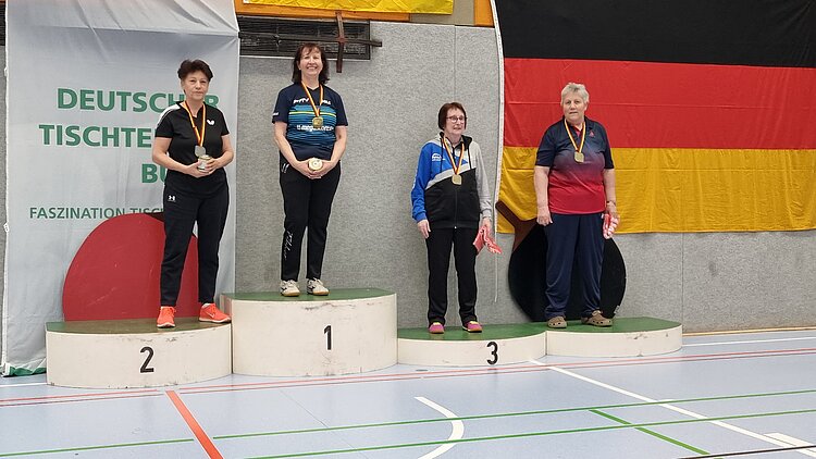 Gleichermaßen souverän spielte Routinier Bernd Schuler (TTG Pellenz) auf, der sich sowohl in den Konkurrenzen Senioren 70 Einzel als auch im Doppel gemeinsam mit Gerd Werner (TTBW) über den Deutschen Meistertitel freuen konnte. Leicht hinter den Erwartungen zurück blieb hingegen die amtierende Weltmeisterin Heidi Wunner (SV Rheinbreitbach) im Seniorinnen 80 Einzel. Hier unterlag sie bereits im Viertelfinale Ruth Schneider (WTTV) in einem knappen Spiel mit 2:3 Sätzen. Doch der Ärger darüber war schnell verflogen, konnte sich Wunner am Ende doch noch über den Doppel- sowie Mixed-Titel in ihrer Altersklasse freuen und sich so zwei von drei möglichen Goldmedaillen sichern.