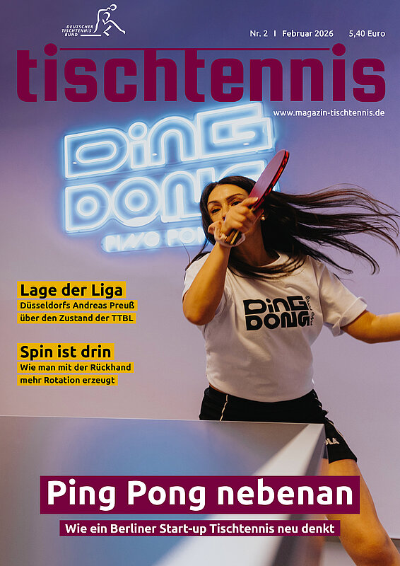 „Ding Dong Ping Pong“ stellt Tischtennis ins Schaufenster – wortwörtlich. Vor knapp einem Jahr eröffneten Waldemar Zeiler und Kian Pariwar ihren Tischtennis-Club, in dem fast alles anders ist, als man es sonst im Tischtennis kennt. In denmodern gestalteten Räumen mit bodentiefen Fenstern im Berliner Szene-Kiez Prenzlauer Berg kann man einen Tisch mieten, Trainingsstunden nehmen oder Events ausrichten. Und das rund um die Uhr. Zeiler und Pariwar wollen Tischtennis neu denken. Wie ist Ding Dong Ping Pong angelaufen? Wer spielt in dem Ping-Pong-Club in der Hauptstadt? Was sind die Pläne für die Zukunft? tischtennis-Redakteurin Susanne Heuing ist nach Berlin gereist, hat den Ding Dong Ping PongClub an der Prenzlauer Allee besucht und mit den Gründern gesprochen. Außerdem in der Februar-Ausgabe: