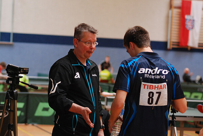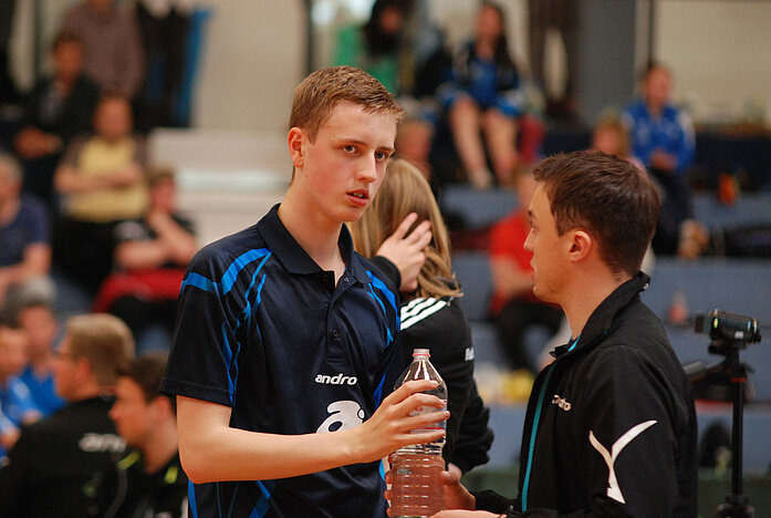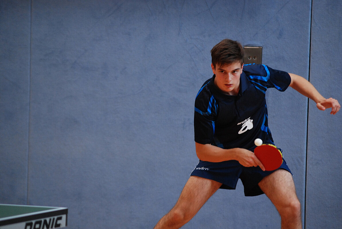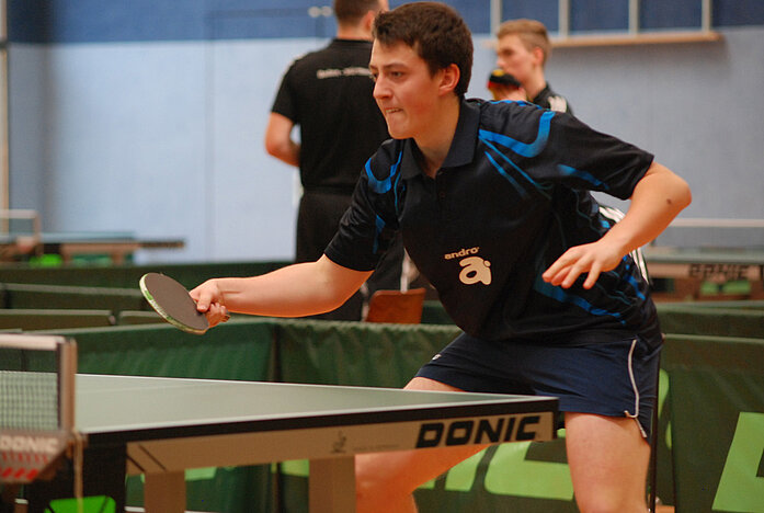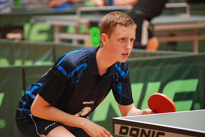 Auch Kevin Eckmann bestritt seine letzten Deutschen Meisterschaften im Jugendbereich und erspielte sein bestes Ergebnis auf nationaler Ebene. Mit einem ebenso überzeugenden wie überraschenden Erfolg über Meikel Sauer (Top12-Spieler) löste Kevin Eckmann in seiner Vorrundengruppe das Ticket für die KO-Runden. Dort legte der junge Simmerner gleich noch einmal nach. Sein Gegner Leon Süß (BaWü) gilt zwar als sehr talentiert, fand aber überhaupt kein Mittel gegen Kevin Eckmanns variables Spiel mit den kurzen Noppen. Mit einem klaren 3:0 stand Eckmann im Achtelfinale. Dort konnte er gegen den Niedersachsen Hohmeier den ersten Satz gewinnen. „In den nächsten beiden Sätzen waren durchaus Möglichkeiten da“, analysierte Torsten Feuckert. Allerdings gingen die beiden Durchgänge an Hohmeier, der im Anschluss dominierte und 4:1 gewann. „Für Kevin war das ein super Ergebnis!“, lobte Trainer Torsten Feuckert.