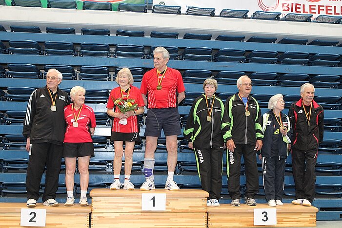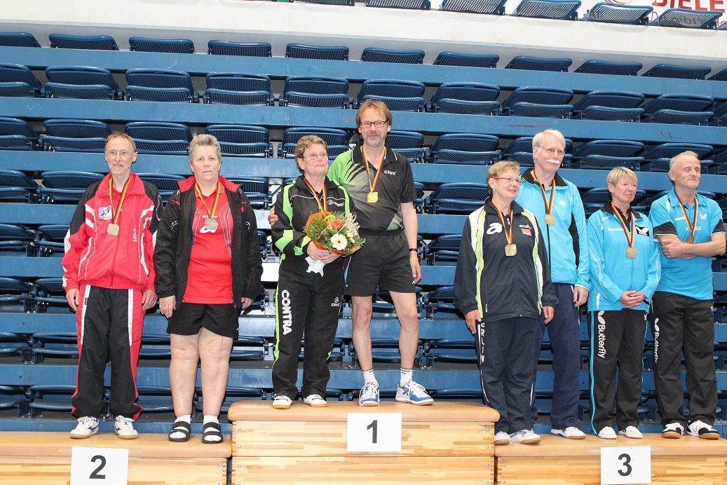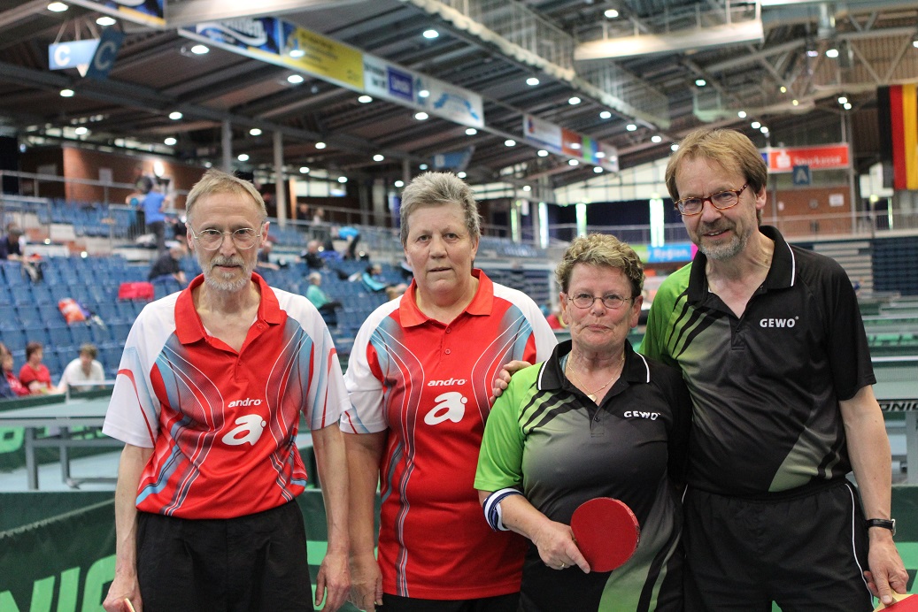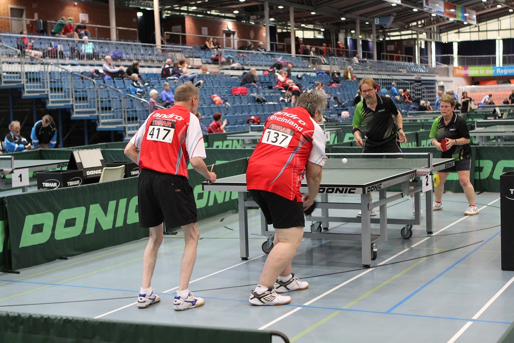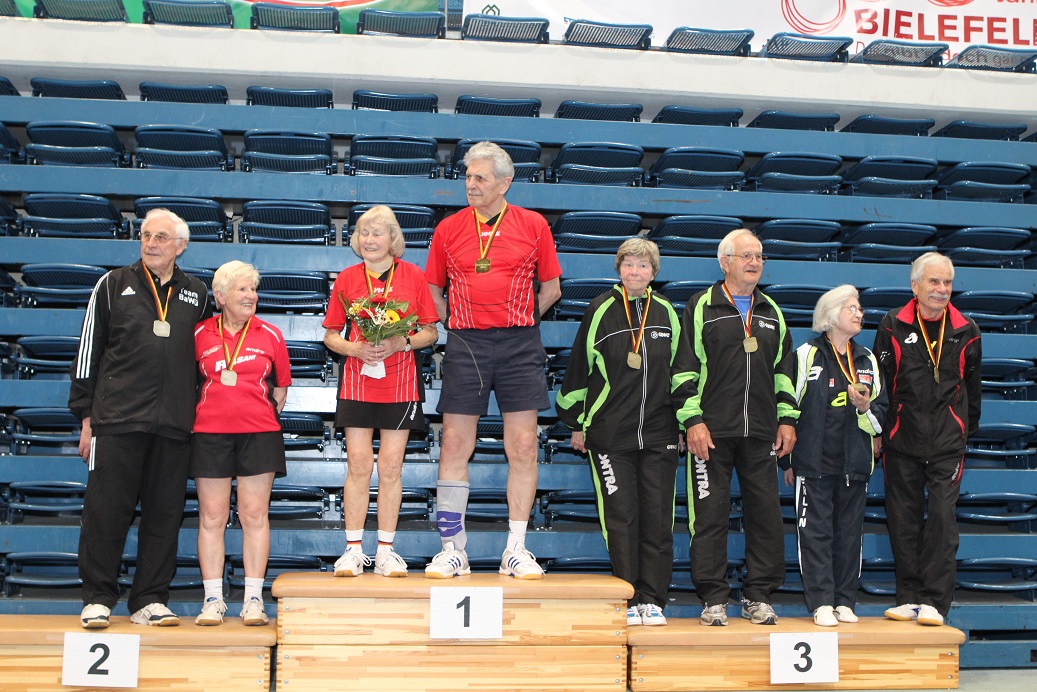 Vom 2.-4. Mai wurden in Bielefeld die Deutschen Meisterschaften der Senioren ausgetragen. Die Spielerinnen und Spieler aus dem Rheinland nahmen insgesamt zehn Mal Edelmetall aus der Seidenstickerhalle mit. Dabei standen Hannelore Dillenberger und Heidi Wunner jeweils in ihren Altersklassen im Doppel ganz oben auf dem Treppchen.