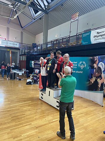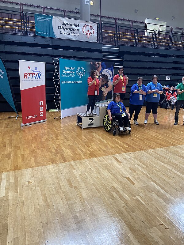 Wie immer kommt das Highlight zum Schluss: Die Siegerehrung. In einer sehr stimmungsvollen Zeremonie bekam jeder Athlet/ jede Athletin eine Medaille oder Schleife, egal ob Letzter, Zweiter oder Erster. Dies ist übrigens auch die erste Zeile der Special Olympics Hymne, die natürlich bei den Ehrungen nicht fehlen durfte.