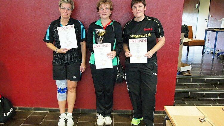 Hannelore Dillenberger verwandelte die Rangliste dann zum Familienfest. Sie siegte in der älteren Frauenkonkurrenz ohne Satzverlust vor Heidi Wunner (Rheinbreitbach), Irmtraut Mohrs (Mühlbachtal) und Karla Gutschmidt (Ehrenbreitstein). Bei den Frauen Ü40 war es richtig spannend. Obwohl Kornelia Braun (Girkenroth) das direkte Duell mit Ursula Schwickert (Kirchberg/Rhaunen) in fünf Sätzen für sich entscheiden konnte, hatte Ursula Schwickert am Ende knapp die Nase vorn. Anja Becker (Rheinböllen) spielte mit ihrem Sieg über Braun Zünglein an der Waage. Hunsrücker Teamwork!
