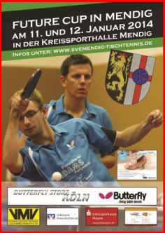 Vom 10.-12.01.2014 richtet die Tischtennisabteilung der SV Eintracht Mendig den DTTB-FutureCup 2014,unterstützt vom TTVR,in der Kreissporthalle in Mendig aus.Spielberechtigt sind Schülerinnen und Schüler der Jahrgänge 2002 und jünger.Details bitten wir der Ausschreibung im Anhang zu entnehmen.