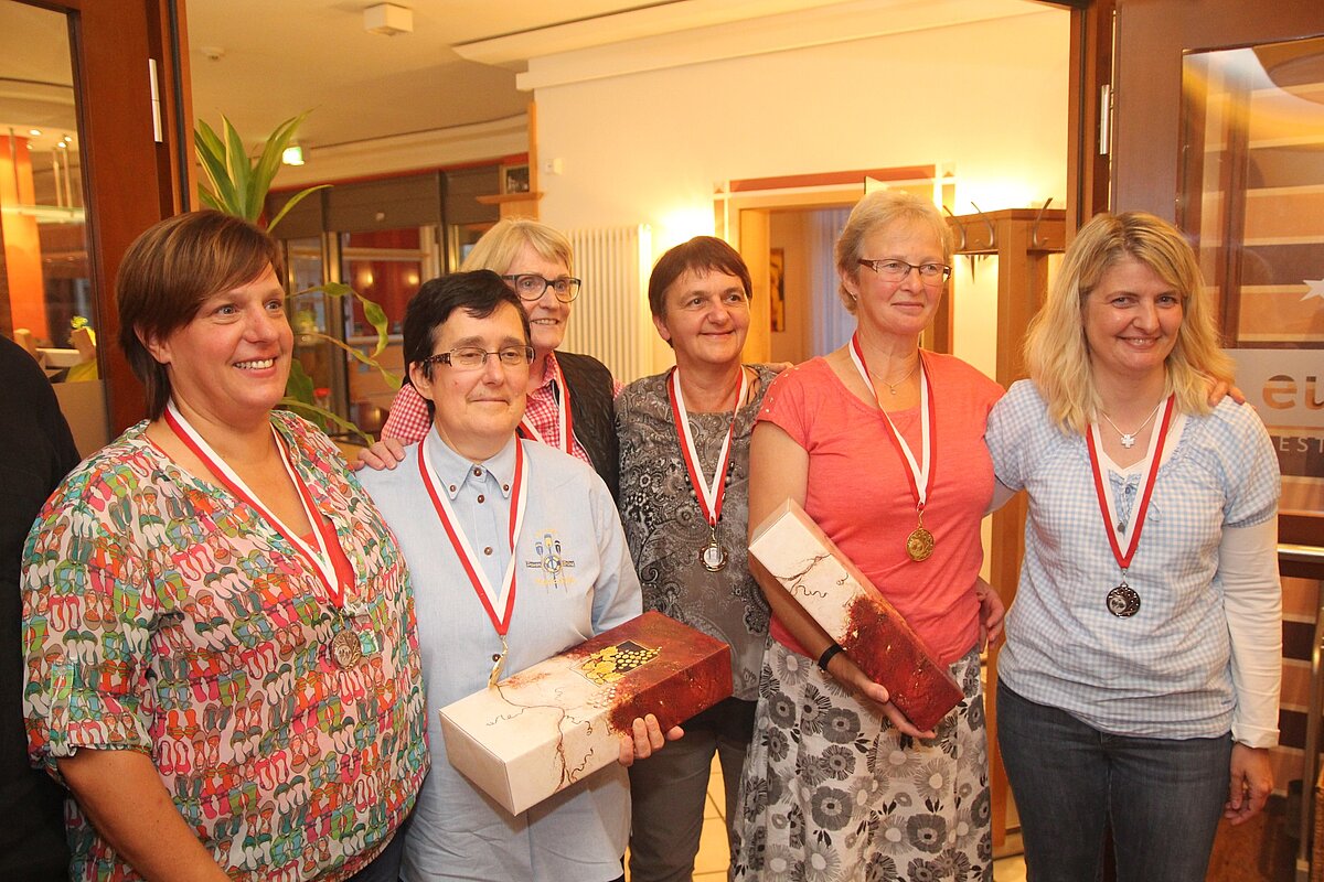Diese Siegerehrung wie auch das anschließende Essen fand im Restaurant des Euvea-Hotels in einer sehr gepflegten Atmosphäre und mit kulinarischen Leckerbissen aus der gewohnt sehr guten Küche des Hauses statt. Danach spielte die Band „Die Zwei“ zum Tanz auf. Hier waren die Belgier dann wieder die Sieger auf dem Parkett. Es folgte, wie erwartet eine lange Nacht, was aber keinen der „Nachtschwärmer“ davon abhalten konnte, sich am nächsten Morgen nach einem Frühstück mit dem Wanderführer Willi Hermes durch die kleinen Sträßchen zur Burg Neuerburg führen zu lassen. Oben angelangt begrüßte sie, in Vertretung der verhinderten Bürgermeisterin Anna Kling, der erste Beigeordnete Lothar Fallis, der, assistiert von Petra Zeyen, zu einem Glas Sekt einlud.