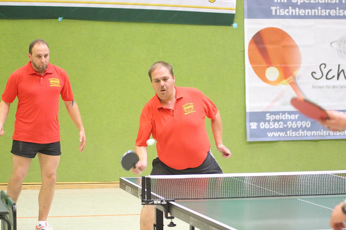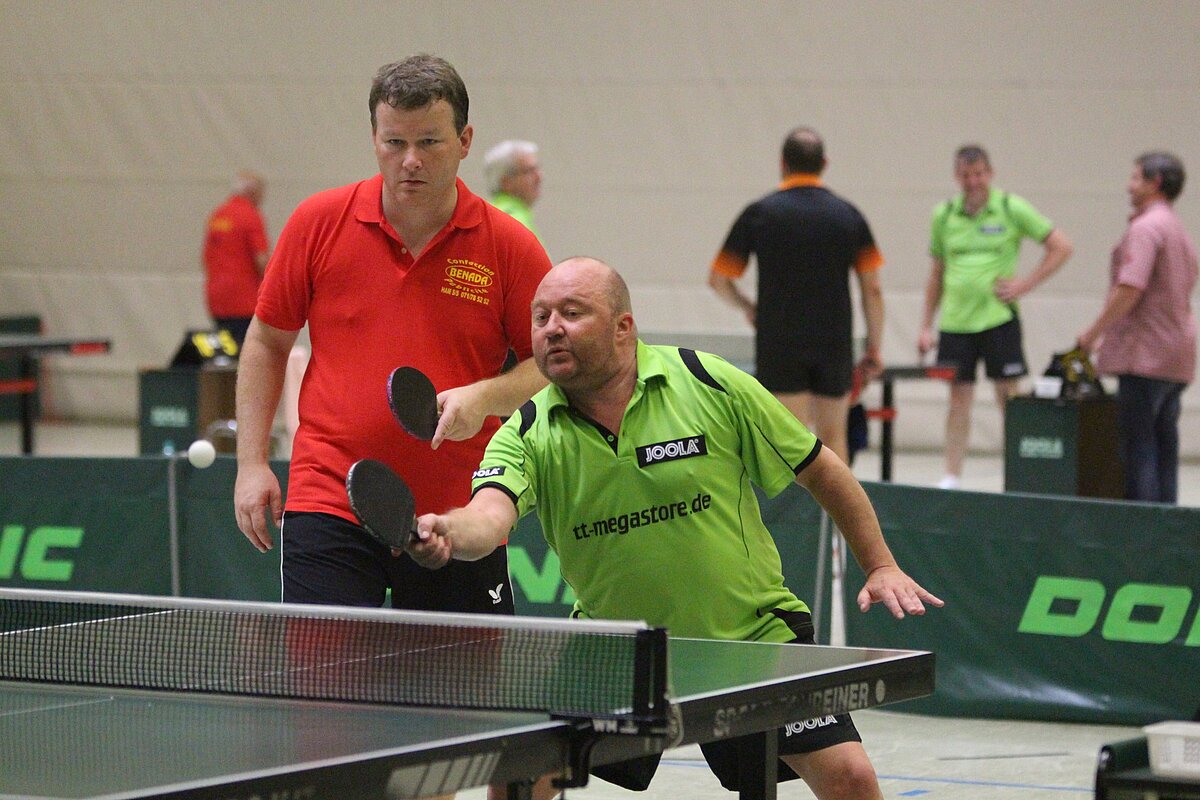 Nach den Einzeln kam es zu den gelosten Doppel-Spielen. Jeweils ein Eifeler wurde einem Belgier zugelost und die Gewinner aus diesen Doppeln wurden erneut in den jeweiligen Los-Topf geworfen, sodass erneut Belgisch/Deutsche Doppelpartner zum nächsten Spiel antraten. Das ganze gipfelte in dem Endspiel Werner Dörr (DJK Herforst )/Jean-Luc Burton gegen Josef Hoffmann (TTC Rommersheim)/Didier Alin. Manche Ballwechsel rissen das Publikum von den Sitzen. Doch im letzten und entscheidenden fünften Satz mußten sich Josef Hoffmann und Didier Alin geschlagen geben. Sie erhielten bei der anschließenden Siegerehrung, die dann wieder in gewohnt äußerst freundschaftlichen und herzlicher Atmosphäre stattfand, die Silbermedaille.