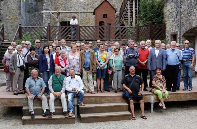 Nach dieser sehr informativen Wanderung durch Neuerburg traf man sich zu einem erneut hervorragenden Essen im Schlosshotel. Anschließend saß man noch eine Zeit lang in gemütlicher Runde. Herzlich war dann der Abschied von den belgischen Freunden; mit einem Dank auch an Henri Baré für seine Übersetzungen ins französische, mit Wünschen für ein gutes Heimkommen und mit der Gewissheit dass man sich in zwei Jahren wieder in Gembloux trifft, wo das hervorragende Essen von José Debled noch allen in guter Erinnerung ist.