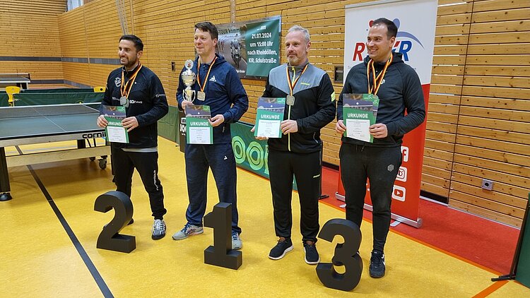 Eine Aussage, die auch die Unparteiischen vor Ort bestätigten. Wie vom Deutschen Tischtennisbund (DTTB) für die Wettkampfebene vorgesehen, sorgten an beiden Tagen der Südwestdeutschen Meisterschaften der Senioren 12 Zählschiedsrichter am Tisch sowie mit Ralf Mainzer und Norbert Wolff ein Oberschiedsrichter (OSR) bzw. Schiedsrichter-Einsatzleiter und stellvertretender Oberschiedsrichter für den sportlich fairen Ablauf. Das Team der Unparteiischen rekrutierte sich dabei aus nationalen Schiedsrichtern, wie sie auch in der Tischtennis Bundesliga (TTBL) eingesetzt werden, sowie Verbandsschiedsrichtern des RTTVR. Ab den K.O.-Spielen wurden alle Klassen am Tisch gezählt. „Am Samstag hatten die Kollegen daher im Schnitt rund 7 Einsätze, am Sonntag vier bis fünf“, zeigte OSR Mainzer das durchaus auch beachtliche Pensum für die Unparteiischen auf. Dazu zählten beispielsweise auch Schlägerkontrollen am Tisch oder die Ballwahl per Münzwurf. Maßnahmen, wie man sie auf Verbands- oder Kreisebene nur selten beobachten kann. Hier zeigte sich einmal mehr: Es ging um etwas für die Teilnehmer in Rheinböllen, nämlich die Qualifikation für die Deutschen Meisterschaften. „Hierzu soll sich natürlich jeder fair qualifizieren können, das ist unsere Aufgabe“, verdeutlichte Ralf Mainzer, der wie auch Horst Scheel allen Teilnehmern große Fairness attestierte. Einzige Kritikpunkte vonseiten der Schiedsrichter: Etwas beengte Verhältnisse und fehlende Handtuchboxen.