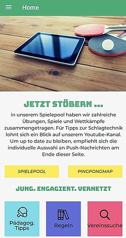 „Spiel Tischtennis!“ bietet einige Rubriken auch für Personen außerhalb des organisierten Sports. Freizeitspieler*innen können mit der ‚PingPongMap‘ Outdoor-Tische finden und sich für die gemeinsame Zeit Spiel für das Tischtennisspiel herausziehen. Mit der integrierten Vereinssuche können sich Interessent*innen erkundigen, wo Tischtennis im Verein angeboten wird. Die Rubrik „Regeln“ gibt jedem TT-Neuling einen Einblick über