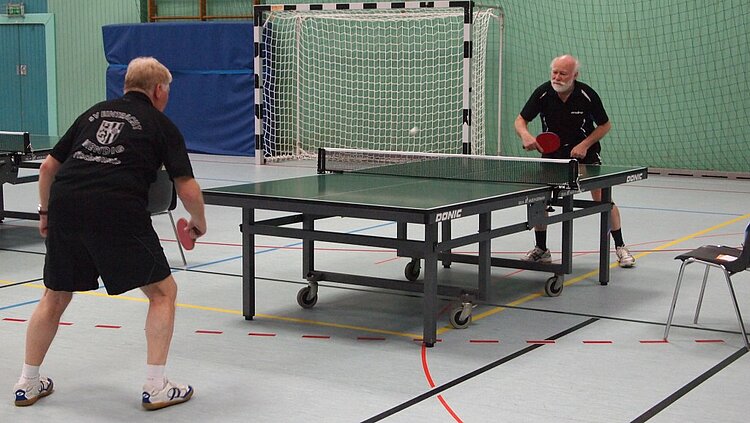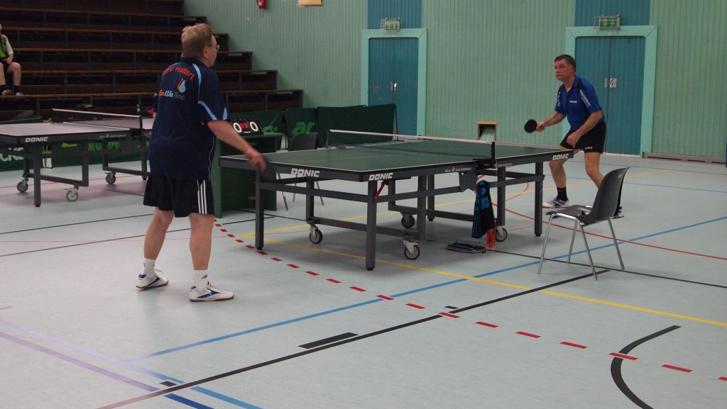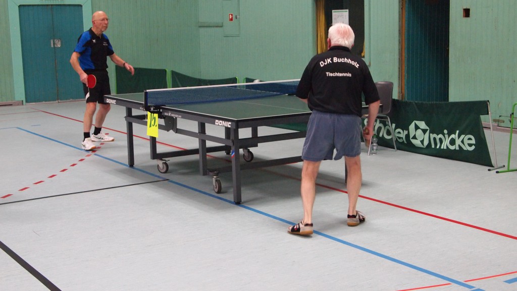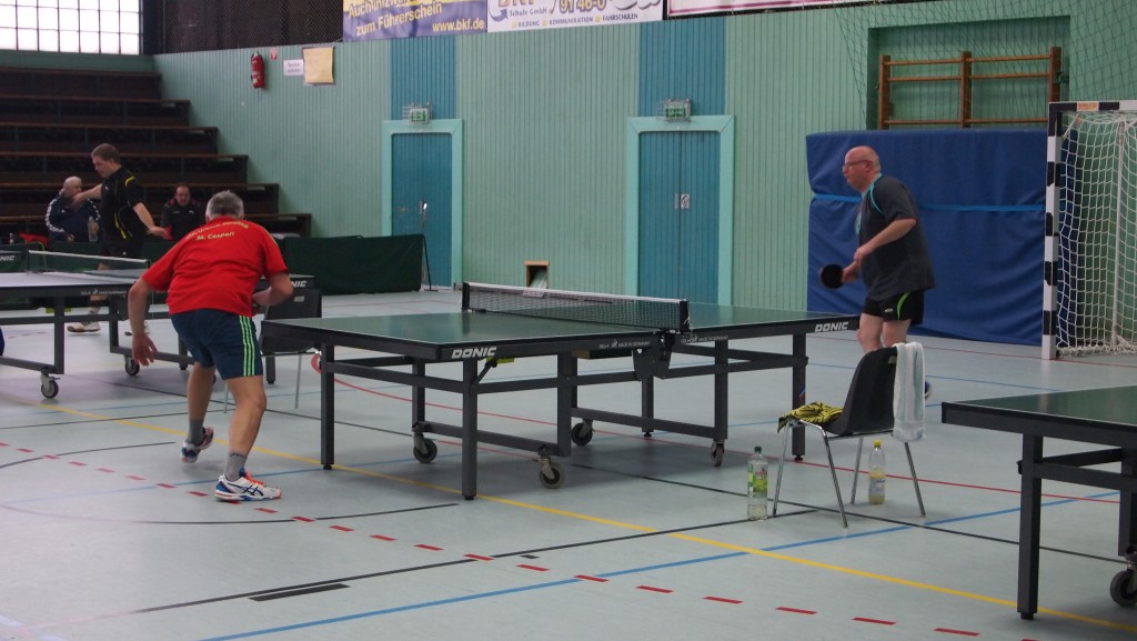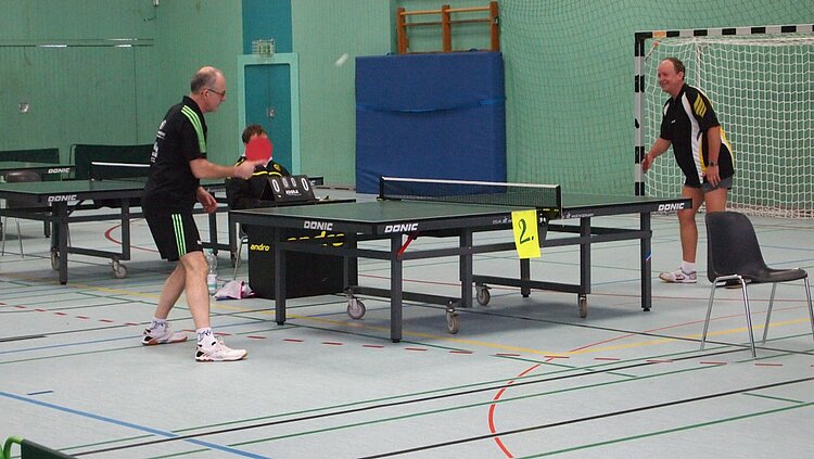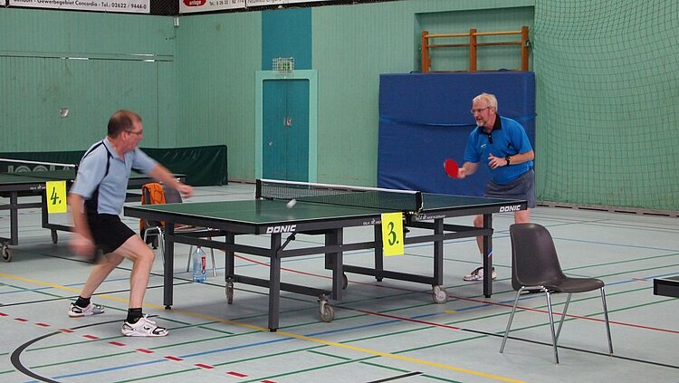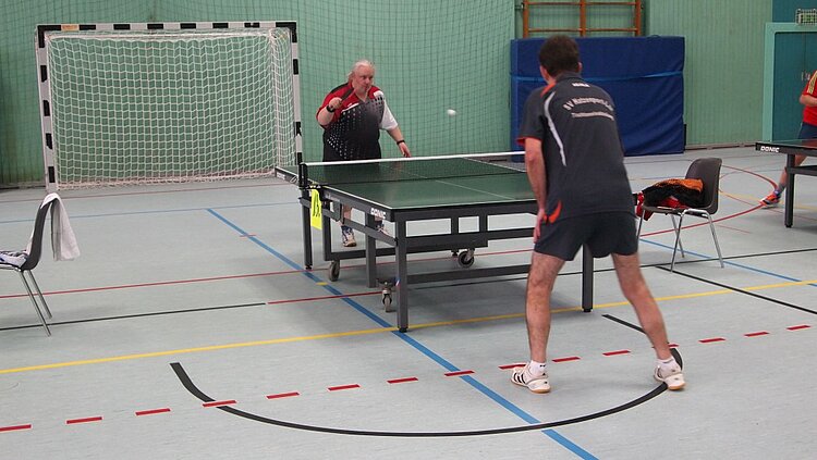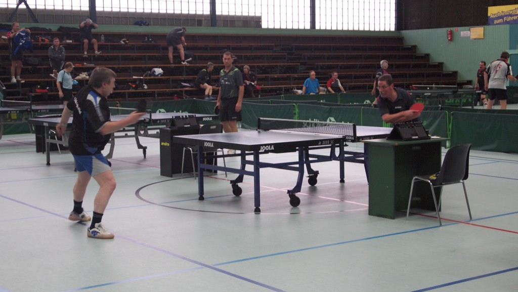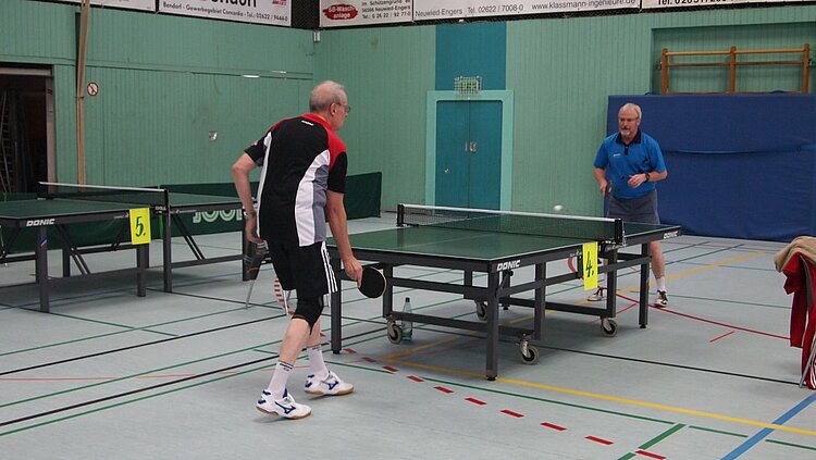 Einen echten „Materialklassiker“ gab es im Finale Ü65 zu bewundern. Der „Noppenprofessor“ Bernd Schuler (Cochem) schlug hier Hans-Herrmann Orthmann (Alsdorf) trotz der gefürchteten Unterschnitt-Rückhand.