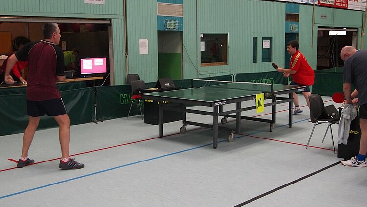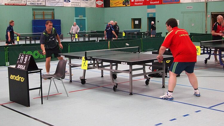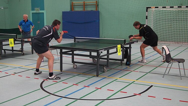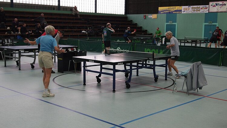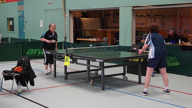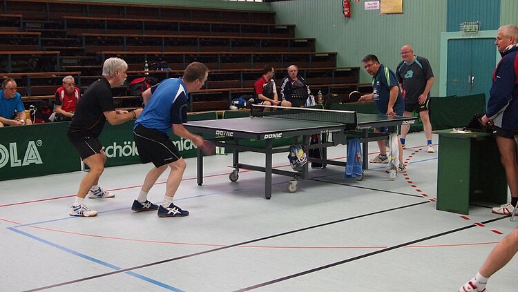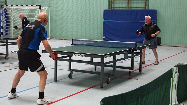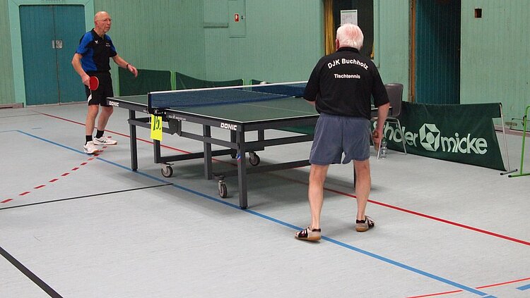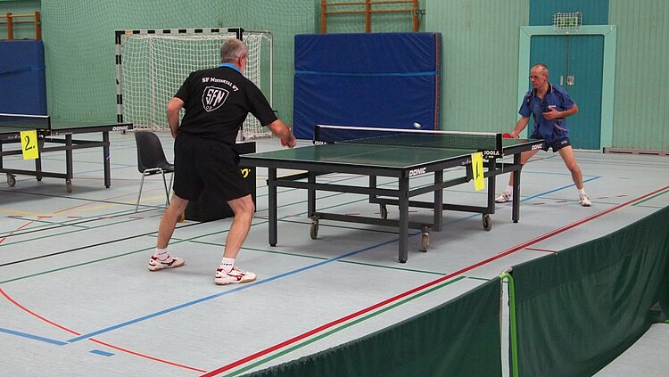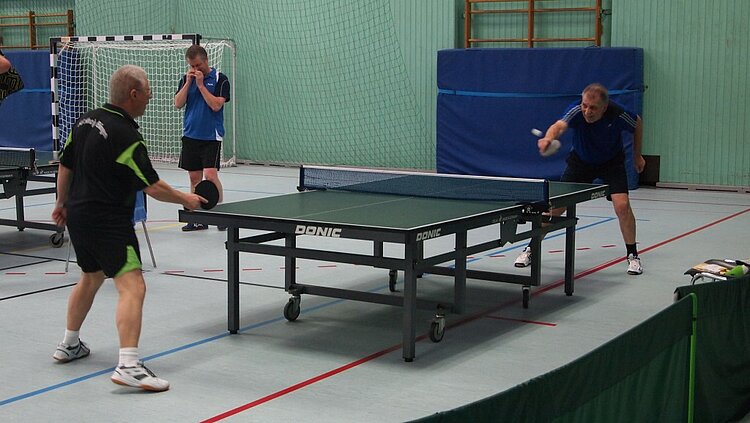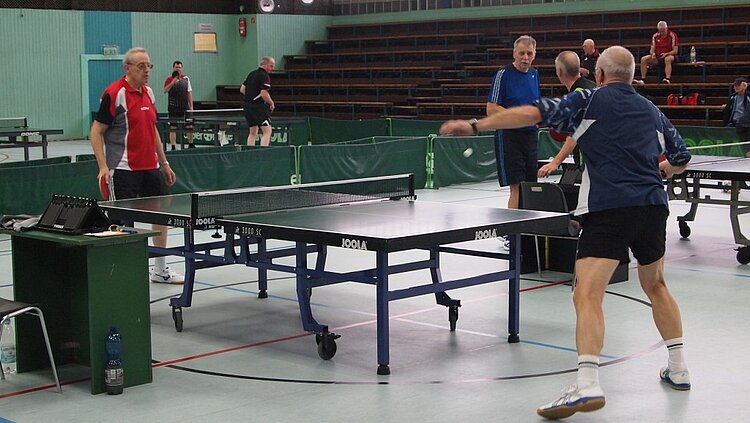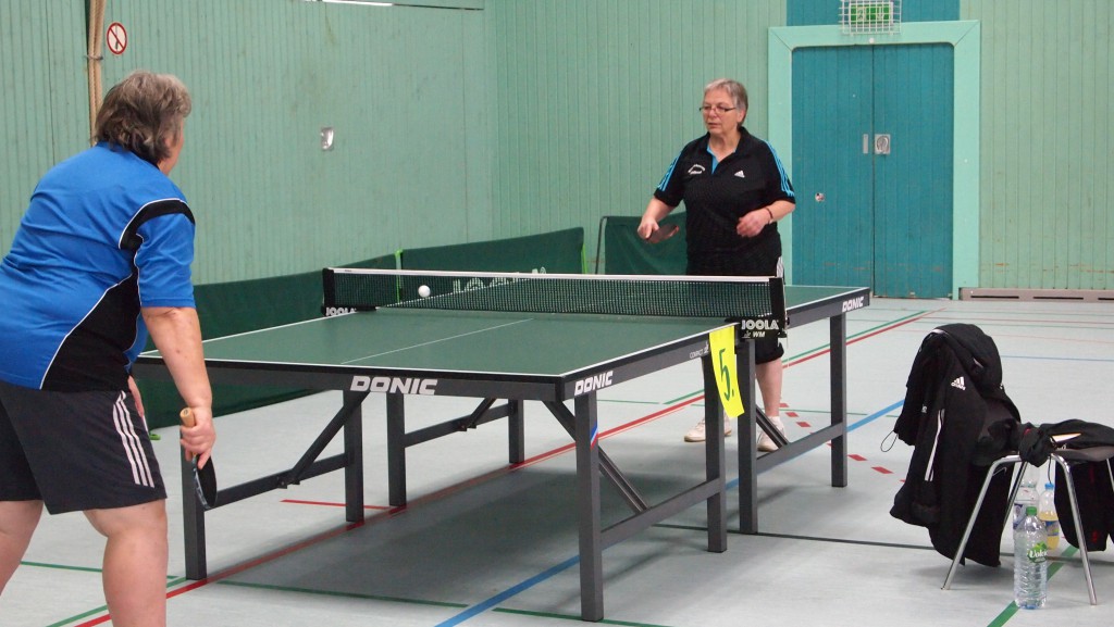 Einen echten „Materialklassiker“ gab es im Finale Ü65 zu bewundern. Der „Noppenprofessor“ Bernd Schuler (Cochem) schlug hier Hans-Herrmann Orthmann (Alsdorf) trotz der gefürchteten Unterschnitt-Rückhand.