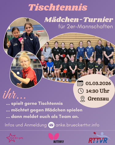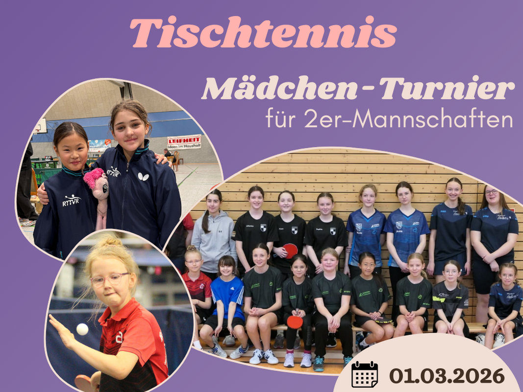 Teamgeist, Spielfreude und jede Menge Tischtennis: Beim Mädchen-Turnier für 2er-Mannschaften steht der Spaß am gemeinsamen Wettkampf im Mittelpunkt. In Zweierteams können sich Mädchen aus den Kreisen Koblenz/Neuwied, Südlicher Westerwald/Rhein-Lahn sowie Nördlicher Westerwald/Altenkirchen miteinander messen und erste oder weitere Turniererfahrungen sammeln.