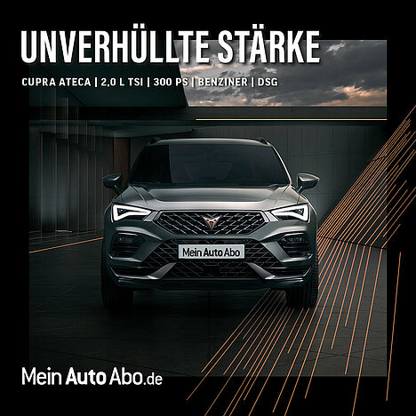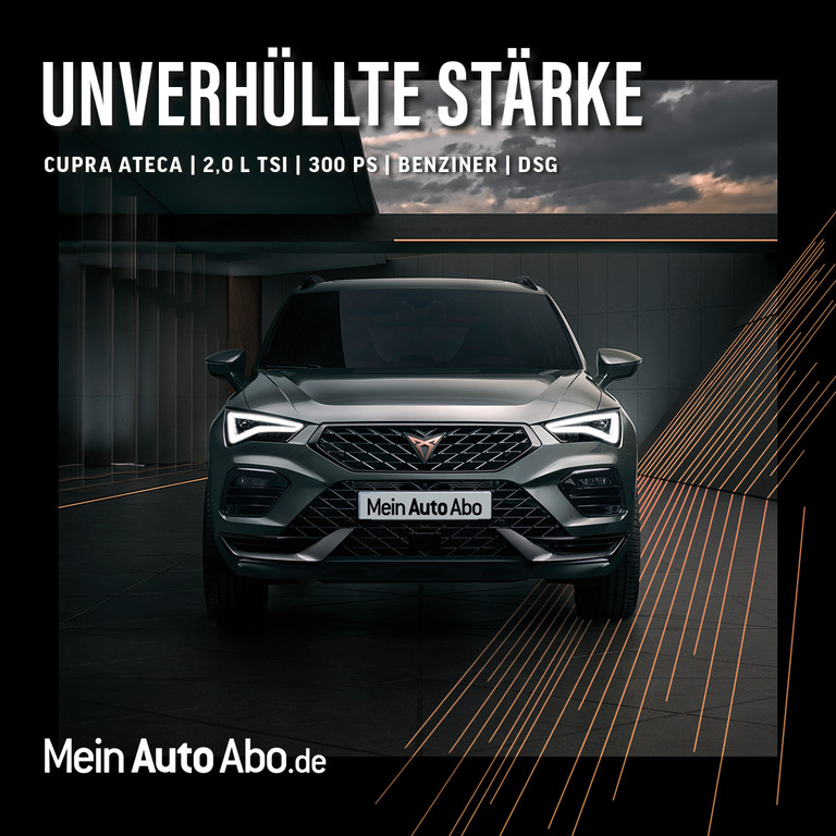 Absoluter Fahrspaß wartet auf Dich. Mit dem Neuwagen-Abo von unserem Partner ASS Athletic Sport Sponsoring steht Dir der sportlich, elegante Cupra Ateca für mtl. 499€ zur Verfügung. Wie immer gilt: Du musst nur noch tanken, der Rest ist schon drin.