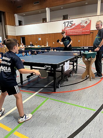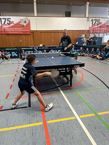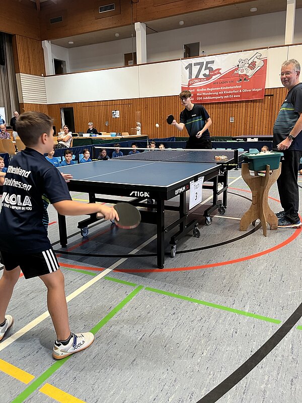 Nach einem Showkampf (moderiert von Verbandstrainer Torsten Feuckert) zwischen den Verbandskaderspielern Richard Strieder und Noel Haupa, der selbst im vergangenen Jahr als RTTVR-Teilnehmer das Bundesfinale in Saarbrücken erreichen konnte, durften auch die minis endlich selbst an die Tische. Zunächst konnten sie noch versuchen von den beiden Spielern spezielle Aufschläge anzunehmen, bevor dann das eigentliche Turnier begann.