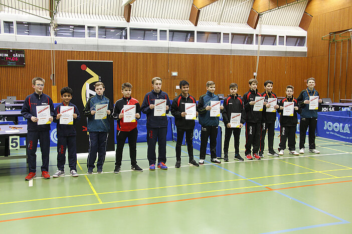 Bei den Schülern sind Felix Köhler (PTTV) und Tobias Sältzer (TTC Zugbrücke Grenzau) bereits für die Deutschen Schülermeisterschaften qualifiziert, durften daher nicht in der Schülerklasse starten. Diese Abwesenheit nutzte Matthias Hübgen (STTB) und setzte sich ohne Niederlage durch. Colin Grave (SV Windhagen) erwischte ein Sahnewochenende, belegte mit nur einer Niederlage Platz zwei. Dahinter platzierten sich mit Enrico Liesenfeld (TTC Hungenroth), Louis Mesenholl (TTC Ockenfels) und Filip Flemming (TuS Weitefeld-Langenbach) gleich drei Rheinländer mit 7:4 Spielen. Hier entschied das Satzverhältnis über die Platzierung und die letzten beiden Tickets zu den Deutschen Schülermeisterschaften zugunsten von Enrico und Louis. Kevin Huynh (TTC Mülheim-Urmitz/Bhf., Platz 7) und Nico Löhlein (1. FSV Mainz 05, Platz 9) rundeten das positive Gesamtergebnis ab.