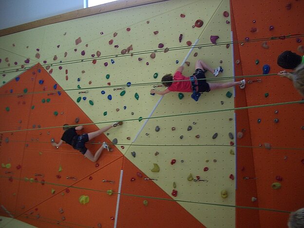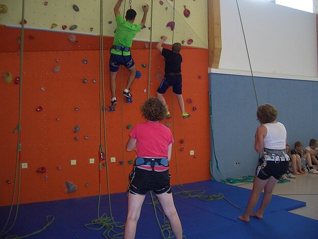 Nach dem Mittagessen ging es an die Kletterwand. Auch hier war die Gruppe in 2 Einheiten geteilt, um möglichst viel zu lernen.