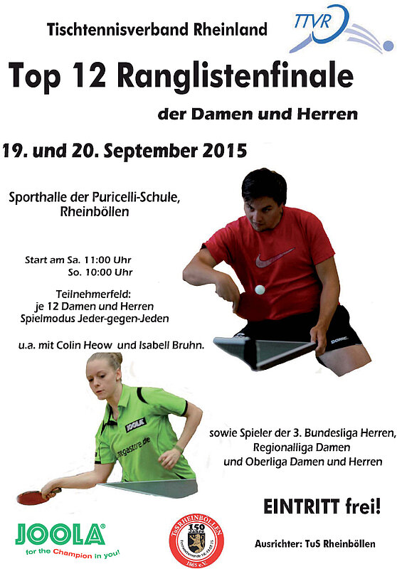 Zum anderen freut sich der TuS auf das Heimspiel eines echten Eigengewächses: Colin Heow vom Oberligisten VfR Simmern begann einst seine Karriere in Rheinböllen und entwickelte sich nach dem Gewinn der Mini-Meisterschaften zu einem der besten Spieler der Rhein-Hunsrück-Region. Der Blick auf das Teilnehmerfeld des Top-12-Turnieres garantiert zudem hochklassigen Tischtennis-Sport: So geht auch der ehemalige deutsche Jugendmeister und aktuelle 69. der deutschen Rangliste, Frederick Jost vom TTC Zugbrücke Grenzau, an den Tisch. Der 21-Jährige spielt im Drittligateam der Westerwälder und gilt als Topfavorit. Gleiches gilt bei den Frauen für Annika Feltens (TTC Mülheim-Urmitz/Bahnhof), die ebenfalls ganz vorne erwartet wird. Zumal es um richtig viel geht: Die Top-12-Gewinner sind direkt qualifiziert für das Bundesranglistenfinale im sächsischen Chemnitz, das am 10. und 11. Oktober ausgetragen wird.