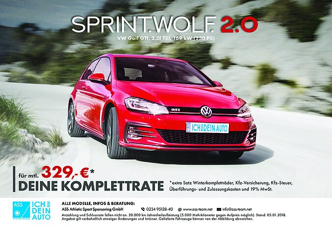 Der VW Golf GTI.Mit dem VW Golf GTI einfach mal direkt im neuen Jahr durchstarten. Bei unserem Partner wartet der SPRINT.WOLF. 2.0 inkl. extra Satz Winterkomplettreifen für mtl. 329,-€* auf Dich.