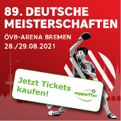 Bremen. Lange mussten Deutschlands Tischtennis-Fans in der Pandemie darauf warten. Am letzten August-Wochenende gibt es wieder Topsport zu sehen. Live, mit Zuschauern vor Ort in der ÖVB-Arena Bremen: die Deutschen Meisterschaften der Damen und Herren am 28. und 29. August. Der Kartenvorverkauf hat für die Edelfans begonnen, die „supporTTer – die dortige Klubmitgliedschaft ist übrigens ein kostenfreies Angebot (https://www.tischtennis.de/supportter.html). Alle anderen können sich die Tickets ab dem 5. August sichern.