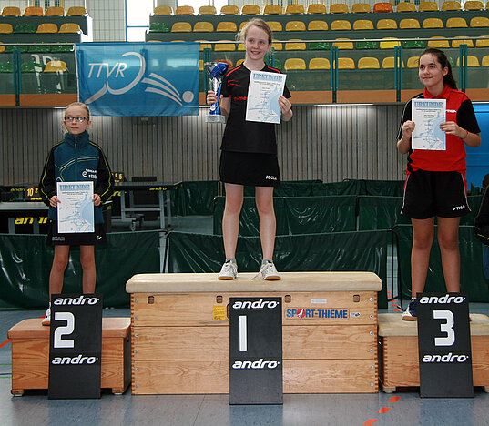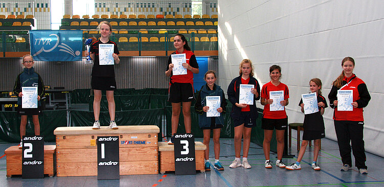 Bei den Schülerinnen setzte sich Lokalmatadorin Ilsa Krebs vom ausrichtenden TTC Mülheim-Urmitz/Bhf. ebenfalls ohne Niederlage durch. Auch sie gab im Turnierverlauf nur 3 Sätze ab. Hinter ihr erreichte Magdalena Hübgen (STTB) mit dem zweiten Platz ebenfalls die Qualifikation zum Top 48 der Schüler. Dritte wurde Liska Märtens (TSV Gau-Odernheim).