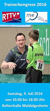 Zum gemeinsamen Trainerkongress (Vereinsservicetag) der Verbände TTVR und RTTV am 09.07.2015 in Waldalgesheim sind bereits Anmeldungen – insbesondere zu den Praxis-Workshops im Bereich der Übungsleiter – eingegangen. Daher sollten sich alle interessierten Vereinsvertreter schnell anmelden um ihr persönliches Paket individuell zu schnüren.