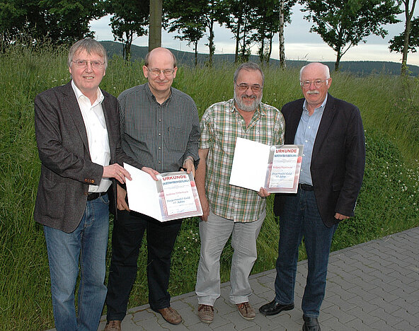 Mit der Siegernadel in Gold für 40 Jahre aktiven Tischtennissport wurden von TTVR-Präsident Heinz Heinz Alfred Fuchs „Wopo Poppelreuter und Andreas Ueberbach ausgezeichnet.