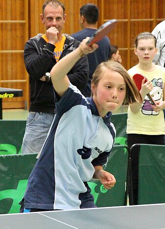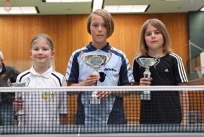 Die 25 Mädchen bis 10 Jahre starteten mit 6 Vorrundengruppen, die ersten 2 jeder Gruppe spielten dann die Platzierungen 1-12, die 3.-5. die Platzierungen 13-25 aus. Nach 2 Hauptrundenspielen konnte sich schließlich Malina Lorenz ( Bad Ems ) im Halbfinale glatt mit 3:0 gegen Hanna Theis ( Greimerath ) durchsetzen während im 2. Halbfinale Pauline Müller ( Norken ) erst nach langem hartem Kampf mit 3:2 und 14:12 im Entscheidungssatz gegen Hanna Füller ( Urmitz ) die Oberhand behielt. Auch das Endspiel zwischen Pauline und Malina war wieder hart umkämpft. Beim Stand von 2:2 zeigte Pauline erneut die besseren Nerven und konnte auch das Endspiel im Entscheidungssatz mit 11:7 für sich entscheiden und sich damit für das Bundesfinale qualifizieren. Das „kleine Finale“ um Platz 3 gewann in einem noch engeren Match Hanna Füller mit 11:9 im 5.Satz gegen Hanna Theis.