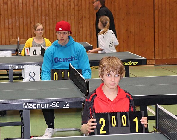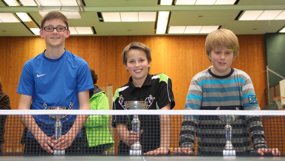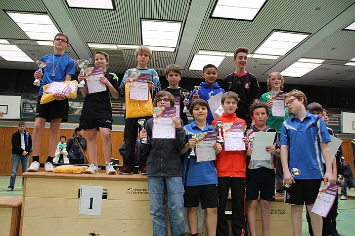Die 15 Jungen in dieser Altersklasse mussten sich zuerst in 4 Vorrundengruppen messen, bevor in der Hauptrunde die ersten 2 jeder Gruppe dann die Plätze 1-8, die anderen die Plätze 9-15 ausspielten. Nach einem knappen 3:2 Sieg im Halbfinale gegen Nico Quirmbach ( Bad Neuenahr-Ahrweiler ) konnte Elias Christ ( Neustadt/Wied ) auch das Endspiel mit 3:1 gegen Jannik Schmid ( Kenn ) gewinnen. Platz 3 sicherte sich Nico Quirmbach durch ein 3:2 gegen Bartosz Kwiatek ( Sellerich ).