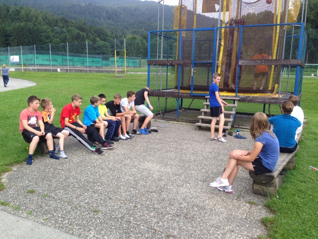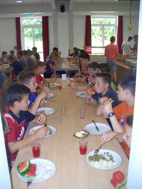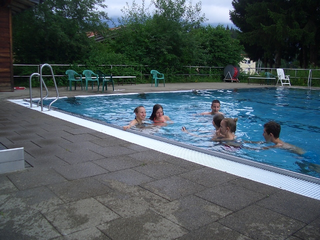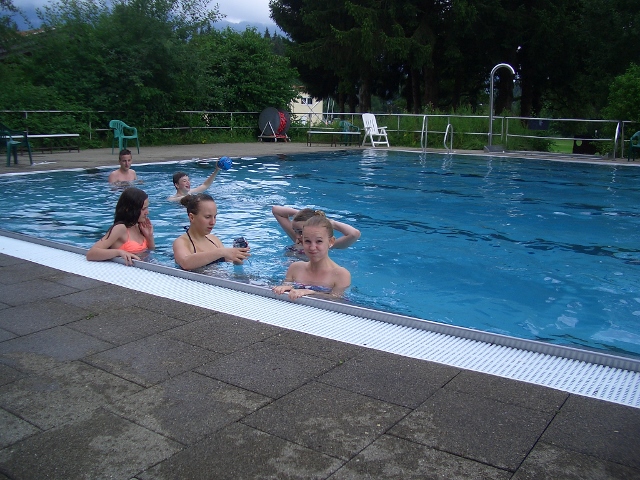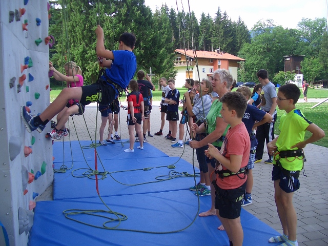 Unter der Aufsicht vom Sportlehrer des Camps und den Hilfen von Bettina und Andrea verbrachten die Gruppe 2+3 den Vormittag beim Klettern. Es war nicht so leicht, alle dazu zu bewegen, aber zum Schluss hatten es dann doch alle gewagt. Das Schwimmen wird meistens von der Bademeisterin Bettina beaufsichtigt. Andrea ist Spezialist beim Hi Ball, und Torsten und Volker leiten das Training ca. dreimal 2 Stunden. Abends haben wir von 21:00-22:00 die Dreifachhalle für uns alleine, wo wir dann verschiedene Spiele machen. Ab 22:00 dürfen sich die Kinder nur noch in ihren Blockhäusern aufhalten, das funktioniert sogar.