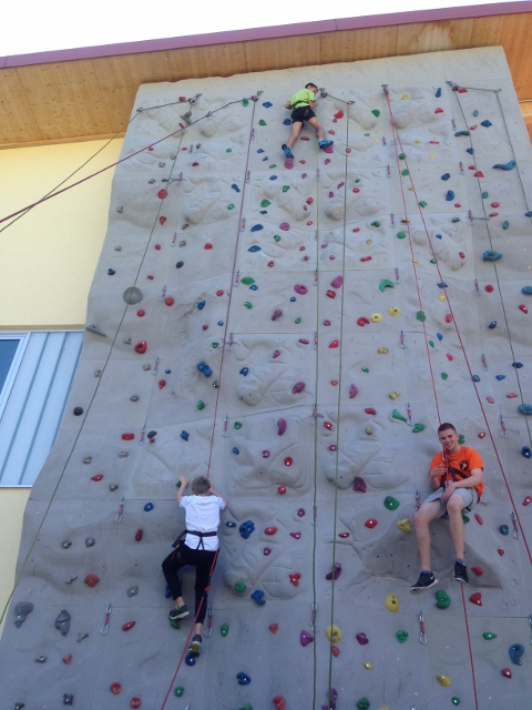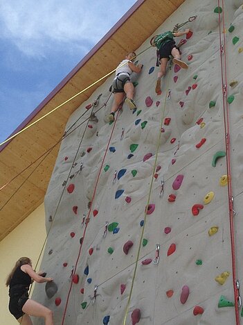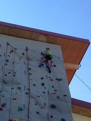 Am sonnigem Dienstag begann nach dem Frühstück die tägliche Tischtenniseinheit für die Gruppe 1, für die Gruppe 2 ging es an die Kletterwand (12m hoch)außerhalb der Halle. Nach einer Einweisung durch Sportlehrer Alfred waren alle noch ein wenig ängstlich. Nachdem Jonas dann das erste Mal oben war, versuchte es fast alle. Die 12 m schafften außer Jonas noch Sarah, Gassar, Jakob, Florian, Franziska, Mona, Nadine, Cara, Johannes, Leonard, Julian und der Top-Kletterer Yannik mit 5 Gipfeln!