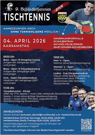 Am 04.April 2026 (Karsamstag) richtet die Tischtennis-Abteilung des TuS Sohren die 9.Schinderhannes-Tischtennis-Open in der Großraumsporthalle des Schulzentrums Sohren-Büchenbeuren aus.In den Spielklassen Boys-Open 19 (Jahrgänge 2007 und jünger,…