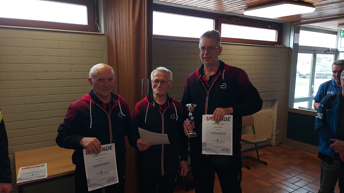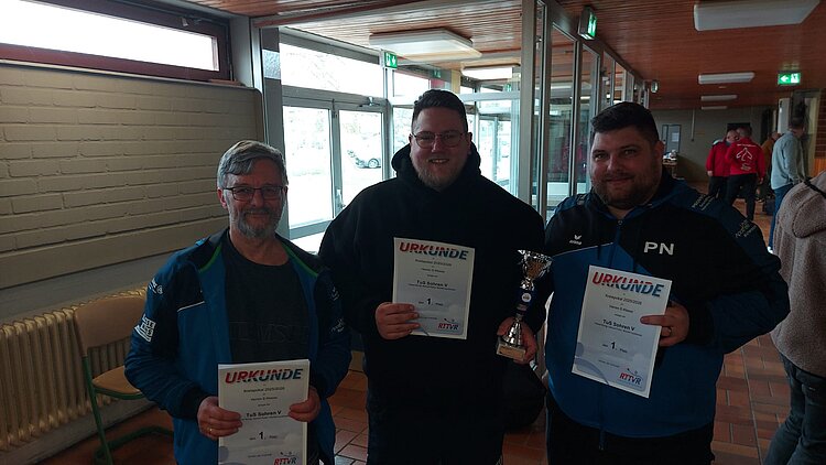 Pascal Ninnig, Sammy Polzin und Michael Lyczkowski vom TuS Sohren V dürfen sich nach ihrem 4:3-Finalerfolg gegen die Akteure des TuS Rheinböllen III freuen. Platzierung Nr. 3 sicherten sich die Mannen der TG Boppard IV mit ihrem 4:3-Sieg gegen den TTV Pleizenhausen IV.