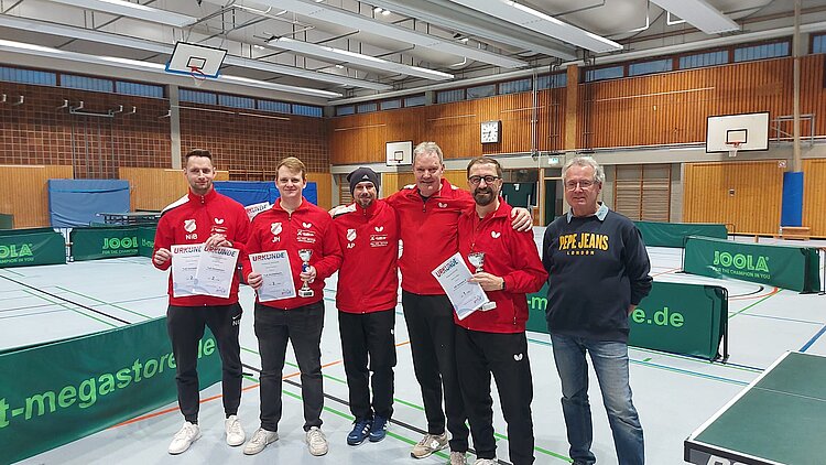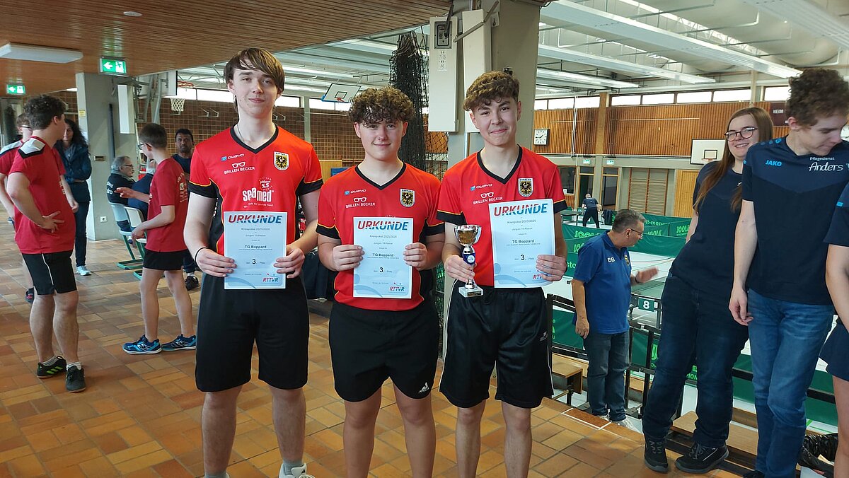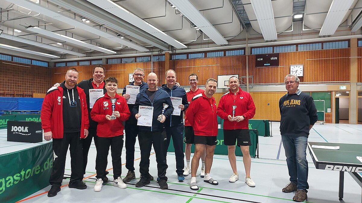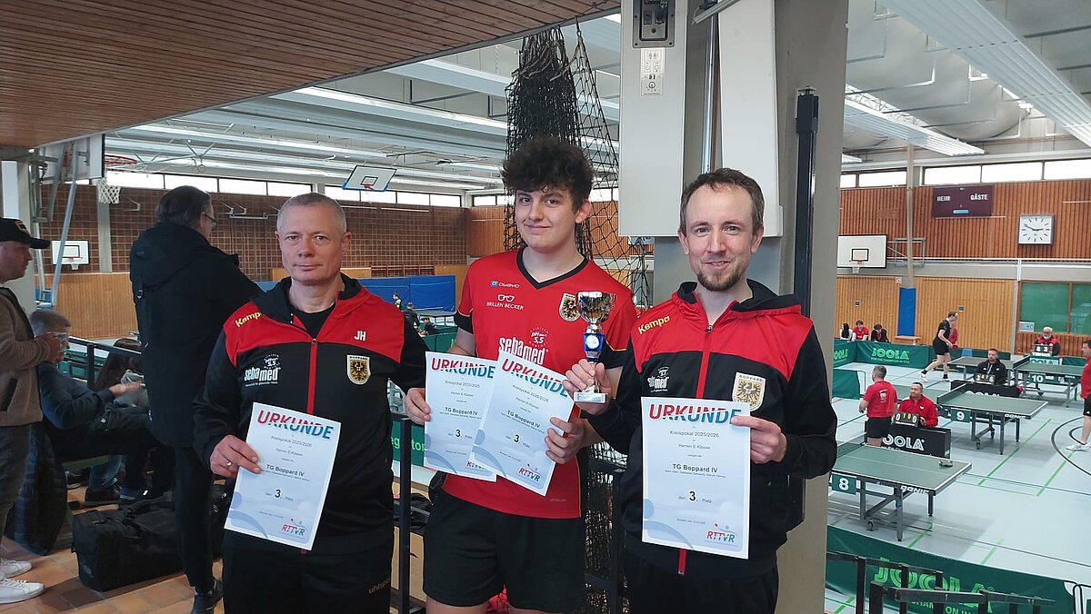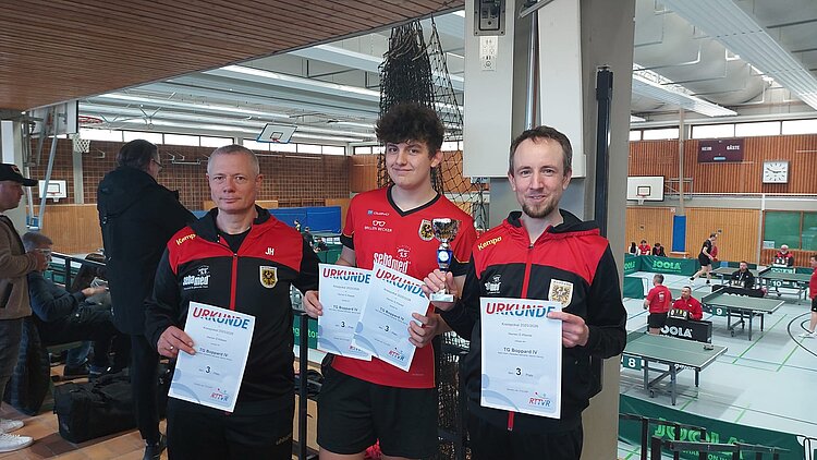Nach einem hochspannenden Finale freute sich die TG Boppard II (Valerij Kim, Florian Bernardy und Heiko Götz) über ihren 4:1-Erfolg gegen die auf Augenhöhe agierenden Konkurrenten der SG Kirchberg/Rhaunen II. Im kleinen Finale behaupteten sich die Sportfreunde Mastershausen mit ihrem 4:2-Erfolg über den TTV Pleizenhausen II.
