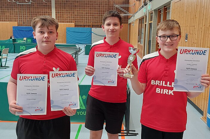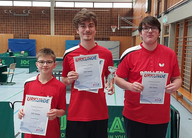 Rang drei belegten die Nachwuchsspieler des TTC Roth (Kalle Wendling, Leon Krautkrämer und Robin Weber) vor den Youngstern der SG Kirchberg/Rhaunen (Jakob Korbion, Liam Herkes und Leandro Kuhn).