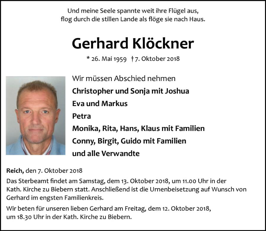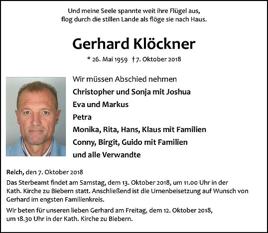 Das Sterbeamt findet am Samstag, 13.10.2018 um 11:00 Uhr in der katholischen Kirche zu Biebern statt, anschließend ist die Urnenbeisetzung auf Wunsch von Gerhard im engsten Familienkreis.