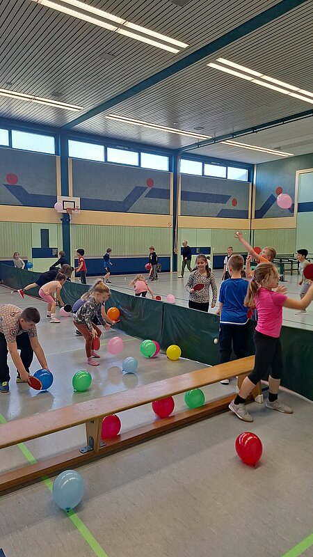 Am Donnerstag, den 25.04.2024 besuchten wir die Michaelgrundschule (größte Aktion in einer Ganztagsschule)in Kirchen.Hier erwarteten uns 6 Klassen, allein nur das 1.+2. Schuljahr mit insgesamt über 100 begeisterten Kindern. Das 3. Schuljahr musste „pauken – hatte offenbar einiges nachzuholen“. Das 4. Schuljahr war auf Klassenfahrt. Zu Beginn stand zuerst einmal das Ballgefühl mit Jumbo-Bällen, bemalten eigenen Bällen und das „Pustespiel“ im Mittelpunkt. Nach kennenlernen der richtigen Schlägerhaltung erreichten die Kinder großen Spaß und Wettkampf bei einer Ballschlacht in der Sporthalle auf dem Molzberg. Die „Kleinsten“ fanden reges Interesse an einem Parcours beim Jonglieren der TT-Bällchen im Eierlöffel, später mit TT-Schläger, mit Trampolin und Ballversenkung in Kästen oder Schüsseln. Großen Dank an die Projektleiterin Frau Inga Löhl mit Ihrem Kollegium um Schulleiter Herrn Lamowski. Stark vertreten war der Heimatverein: VFL Kirchen mit dem Abteilungsleiter: Steffen Rosenthal, dem Jugendwart: Max Graf, dem Jugendtrainer: Andre Gabriel u. der Pressewartin: Claudia Geimer.
