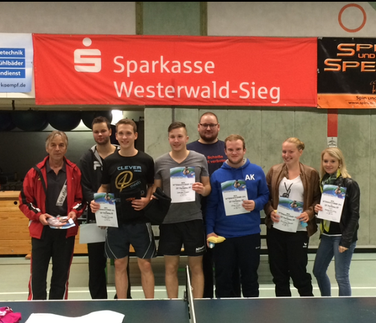 Die besten „heimischen Nistertaler“ im Einzel waren Ramona Burbach und Konny Braun, für beide war im Achtelfinale Schluß. Ein rein sportlich gesehen schwaches Abschneiden des Heimvereins, oder sollte man „Gastfreundlich“ sagen? Dafür hatten die Meisten ja anderes zu bewältigen. Die Küche war wieder von Küchenbulle Andreas Weyand gut geführt und die Currywurst mit Sansibar-Soße sau lecker, die Turnierleitung mit Kurt Meteling, Jörn Müller und Moritz Beib funktionierte (bis auf eine halbe Stunde) großartig, das Aufräumteam um Danny Ott kam seinen Pflichten nach – also hatte Organisatorin Ramona Burbach im Vorfeld alles gut bereitet.