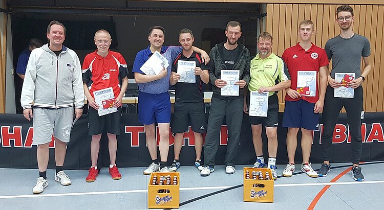 Der Einzelwettbewerb des ASV wird als Vorgabeturnier ausgetragen (1 Punkt pro 80 QTTR-Punkte). Das Turnier ist auf 64 Teilnehmer begrenzt, aber das Feld wurde etwas kleiner, da einige gemeldete Teilnehmer zu kurzfristig abgesagt hatten. Nach einer Gruppen - Vorrunde wird dann unter den letzten 32 im KO-System das Turnier entschieden. Lange Zeit galten die beiden QTTR-1900er Kai Otterbach (QTTR 1969, TTC Hausen, Inhaber vom TT-Shop Spin-und-Speed.de) und Bernd Schuler (QTTR 1917, TV Cochem, Deutscher Meister der Ü70, mit seinen Noppen-Außen auf Vor- und Rückhand auch der HEXER genannt) als Favoriten. Aber beide vielen dann irgendwann dem Vorgabesystem zum Opfer; glänzen konnte hier vor allem Alexander Geis, ein Spieler des TTV Höhn mit QTTR 1399, der seine Vorgaben gut zu nutzen wusste und sich erst im Endspiel dem unangenehmen (auch 2 x Noppe-Außen) Alexander Döll der TTG Pellenz im fünften Satz geschlagen geben musste. Einige lange Spiele in der KO-Runde sorgten dafür, dass dies dann erst gegen 4 Uhr in der Nacht den spannenden Abschluss setzte.